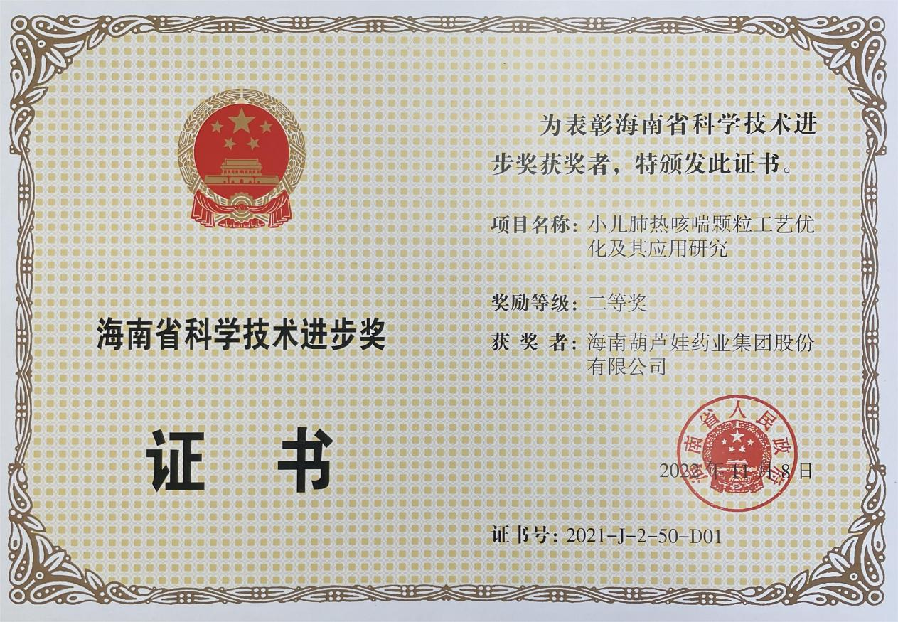 为此,小儿肺热咳喘颗粒的制备方法获得了第二十一届中国专利优秀奖(2019年),专利申请号:ZL201010134951,此次作为专利技术的应用,获得了2021年度海南省科学技术进步奖二等奖。在此之前,pp极速糖果1000牌小儿肺热咳喘颗粒还多次被授予“临床价值中成药品牌”、“中国连锁药店最具合作价值单品”,荣登“中国医药品牌榜”。